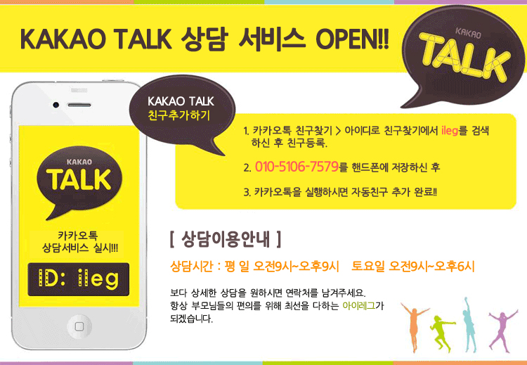 카카오톡 친구찾기에서 아이디 ILEG를 입력하시고 친구추가를 하시거나