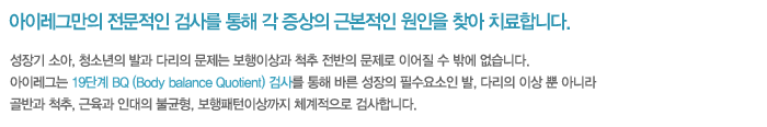3차원적인 움직임 등을 측정합니다. 골반의 부정렬은 근골격계 통증과 척추측만증으로