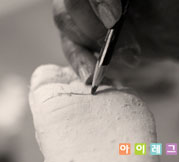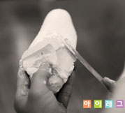 석고가 굳으면 석고를 깍아 다듬는다.