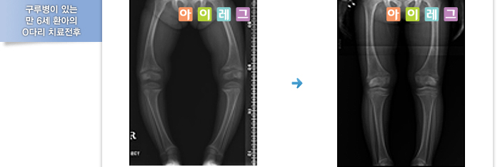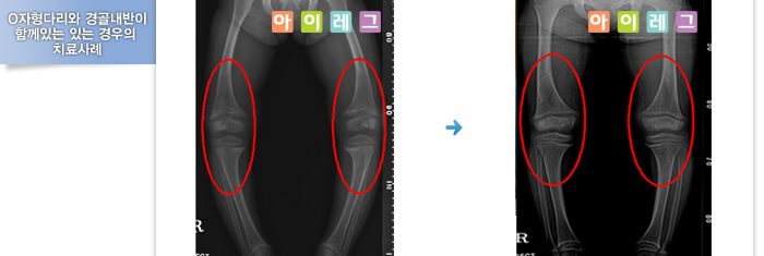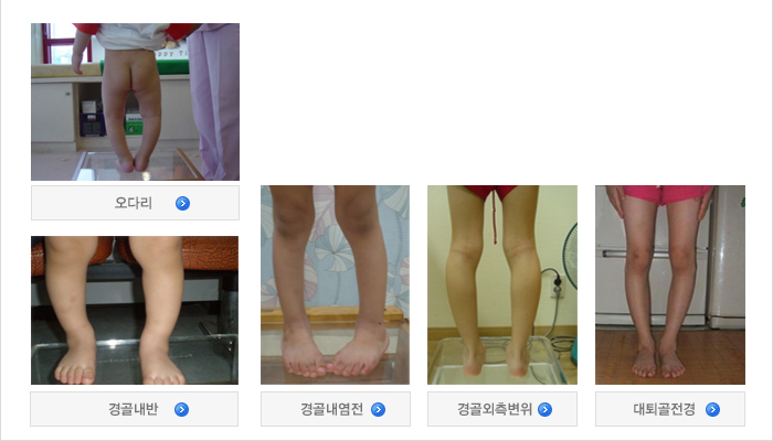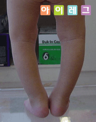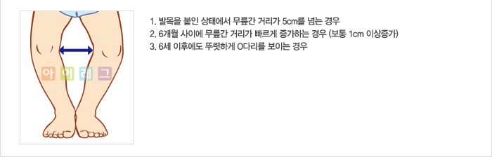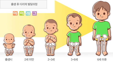 O자형 다리는 양쪽 발목을 살짝 붙인 상태에서 무릎이 벌어지는 경우를 말합니다. 그림처럼 신생아는 태내에서 자궁 내 공간의 제약으로 다리가 약간 휘어있는 상태로 출생하여 만2세 이전까지는 정상적으로 약간 O자형 다리를 보일 수 있습니다. 그 이후는 다리가 곧게 펴지고 만3세 이후는 다시 X형다리를 보이다가 만6-8세가 되면 다시 다리가 곧게 펴집니다. 대부분의 아이들은 치료할 필요가 없을 정도로 정도가 심하지 않지만 어떤 아이들은 눈으로 보기에도 심한 O다리나 X 다리를 가질 수 있습니다. 아이가 무릎을 붙인 상태에서 무릎간 거리가 5cm를 넘으면 비정상적인 O다리로 봅니다. 이 경우 전문가의 상담을 받아보는 것이 바람직합니다.